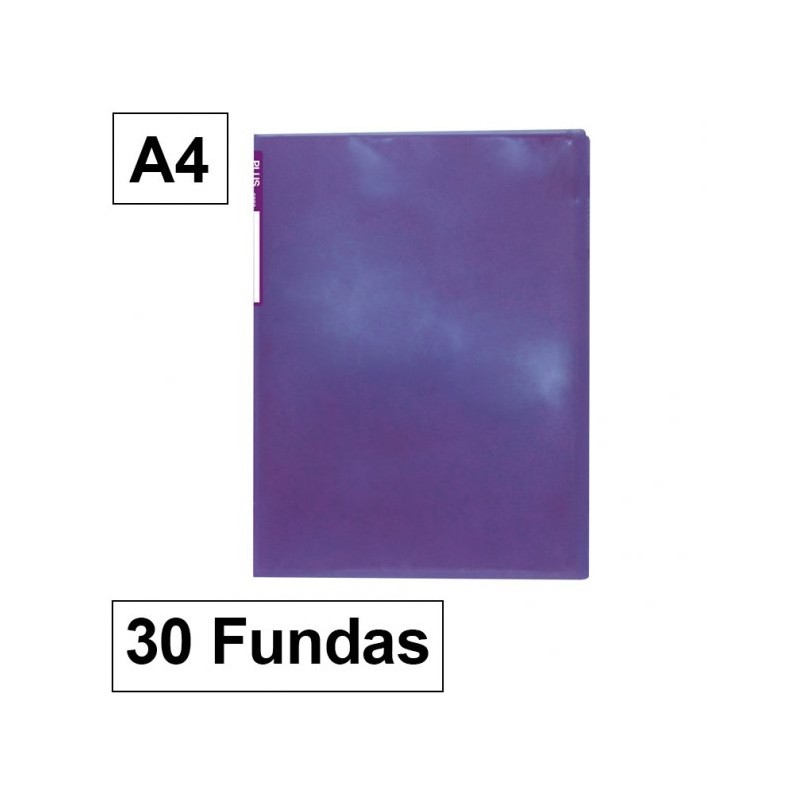 Tapas de polipropileno flexibles. Fundas transparentes de polipropileno antireflejo de 45 micras y resistentes a las fotocopias. Soldadas al lomo. 30 fundas. Color violeta. Medidas: 230 x 305 mm.