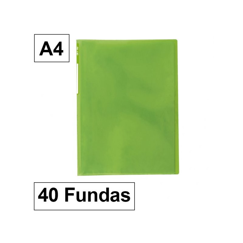 Tapas de polipropileno flexibles. Fundas transparentes de polipropileno antireflejo de 45 micras y resistentes a las fotocopias. Soldadas al lomo. 40 fundas. Color verde. Medidas: 230 x 305 mm.